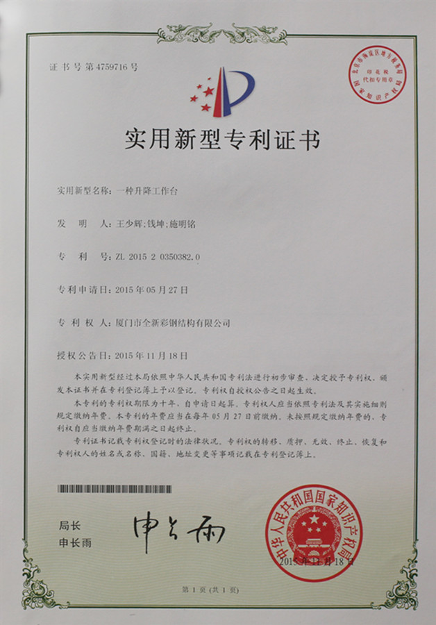 ใบรับรองสิทธิบัตรของแพลตฟอร์มลิฟต์