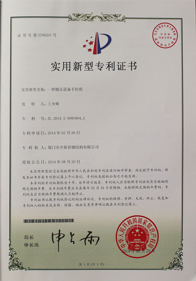 ใบรับรองสิทธิบัตรเครื่องตัดแบบใช้มือ